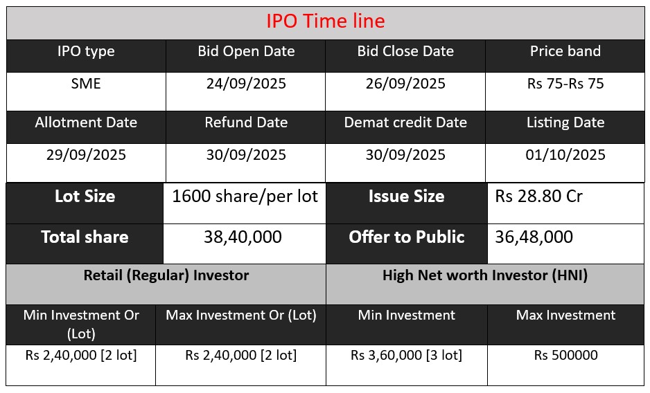 Gurunanak Agriculture India Ltd is launching a ₹28.8 crore IPO on the NSE Emerge platform. The issue opens on September 24, 2025, and closes on September 26, 2025. Investors can bid for 38.4 lakh equity shares at ₹75 each. The funds raised will support setting up a new harvester manufacturing unit, working capital requirements, and general corporate purposes. Listing is scheduled for October 1, 2025.
