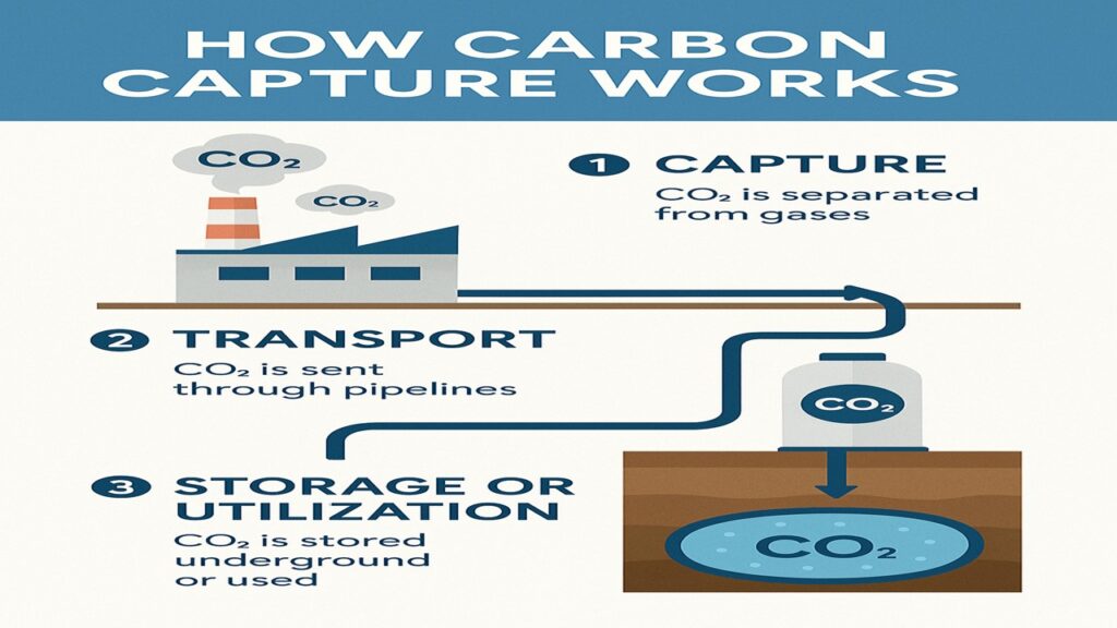 - 🧲 Capture – CO₂ is separated from gases using chemicals or special machines.